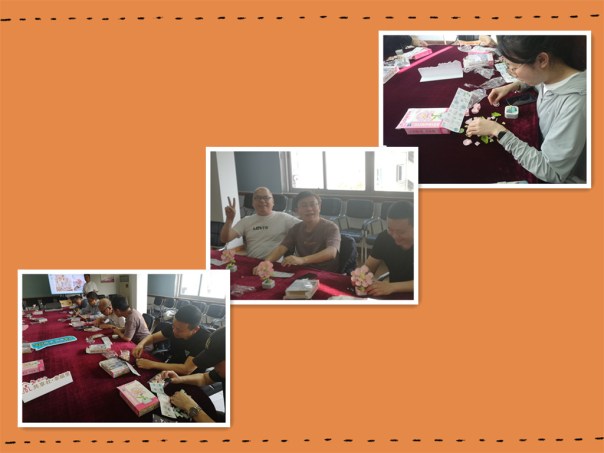 经过大家的不懈努力,每个人面前都有一朵绽放的芙蓉花,朵朵芙蓉花盛开的那样鲜艳。阿,万紫千万才是春,春的使者给大家带来了欢乐。志愿者的脸上露出了笑容。都夸“好看!好看!”、“我的动手能力还不错”、“我还不老”、“有收获”,大家议论纷纷,欢聚一堂,本次阅读活动得到了升华。