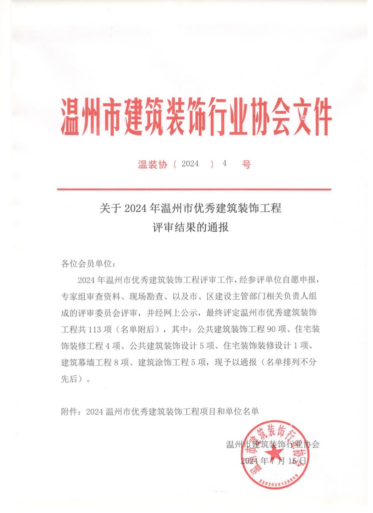 附件:2024年温州市优秀建筑装饰工程项目和单位名单